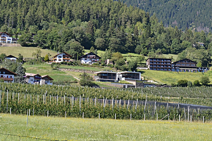 Das Gebäude besteht aus 2 Baukörpern, die der natürlichen Falllinie des Hanges entsprechend, abgeknickt sind, verbunden durch ein eingeschossiges mit Naturstein verkleidetes Gelenk. Gestalterisches Anliegen war es, das große Volumen schonend und gutproportioniert in den Hang einzubauen und mit Sensibilität auf die landschaftlichen Gegebenheiten zu reagieren.