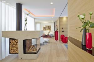 Ein verglaster Aufzug erschließt die Penthousewohnung. Das Geländer wurde in gelochtem Schwarzstahl gestaltet. Der Handlauf wurde in Holz ausgeführt, die Auflager des Handlaufs bilden Kiefernzapfen, sie wurden dem Original des alten Geländers nachempfunden. Über einen Vorraum mit eingebautem Garderobeschrank, als Maßmöbel gefertigt, betritt man die Wohnung. Die zentrale Position nimmt der Wohnraum mit seinen großflächig verglasten Wänden und der davor gelagerten Panoramaterrasse ein. Ein skulptural gestalteter Ofen trennt den Wohn- vom Essbereich. Die Küchentheke wurde mit rot emailliertem Glas verkleidet, der Küchenschrank verbirgt sich hinter farbig gestalteten Glasschiebetüren. Vom Wohnraum betritt man das Schlafzimmer. Ein rot lackierter Schrank als Raumteiler trennt den Schlafbereich vom Badezimmer. Der Schrank hat seitliche Auszugfächer für Wäsche in Eiche natur. Über das Bad gelangt man in die Ankleide, einen begehbaren Schrankraum. Die Möbel wurden in Eiche gefertigt und auf den Boden abgestimmt. Das Highlight bildet die über der Wohnung liegende Dachterrasse mit den farbigen Polstermöbeln und dem traumhaften Blick auf Meran.